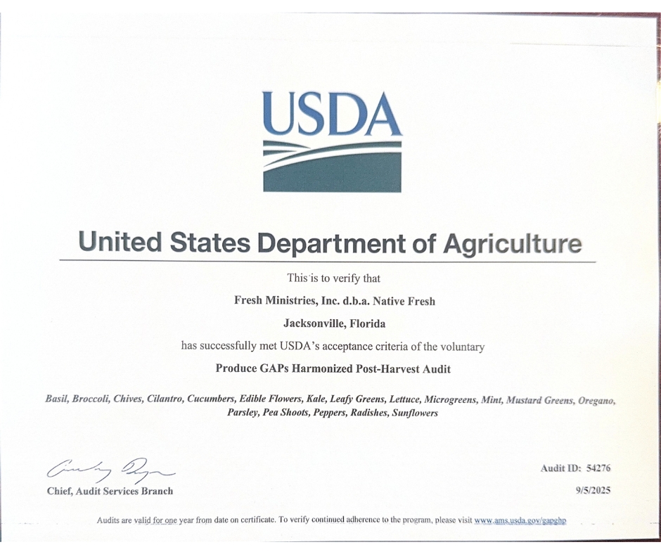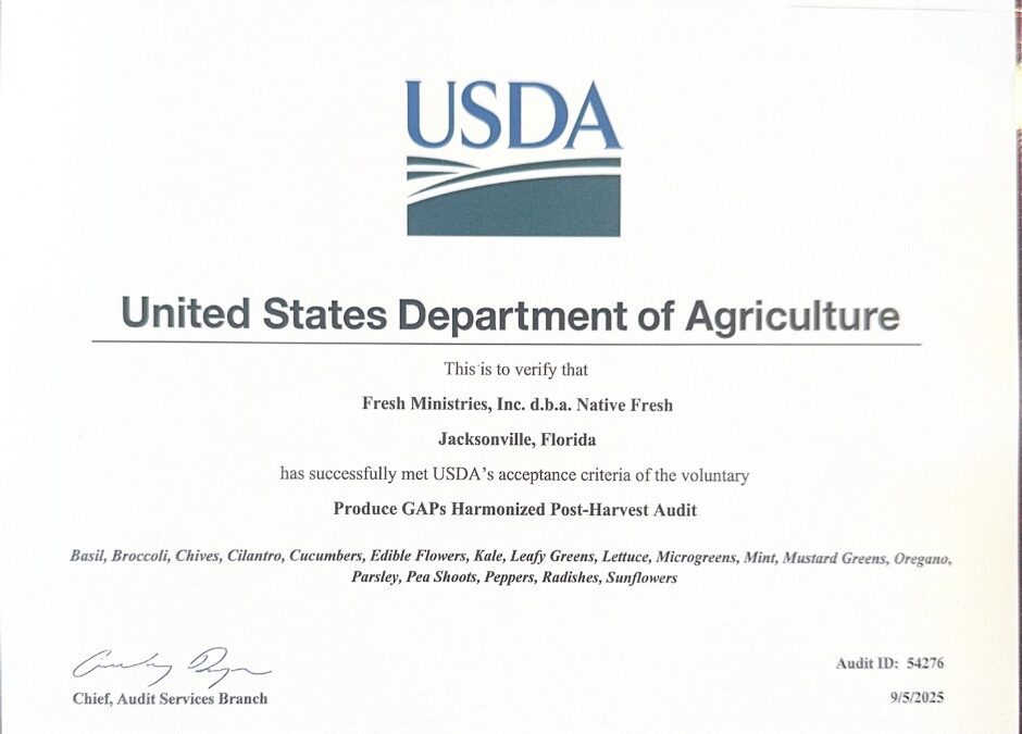 FreshMinistries is proud to announce that Native Fresh, our aquaponics urban farm in Jacksonville, Florida, has once again achieved USDA Harmonized Good Agricultural Practices (Harmonized GAP) certification — one of the most rigorous and respected food safety audits in the nation.