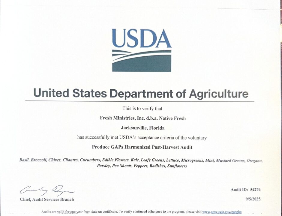 Native Fresh Aquaponics Facility Earns USDA Harmonized GAP Certification